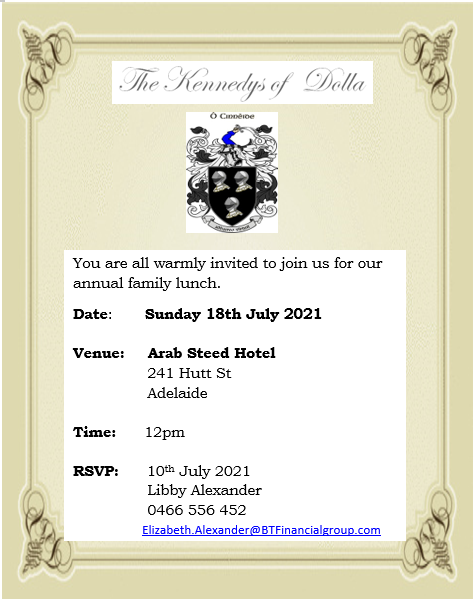 Don't forget you will need the password for this section of the website.  If you have forgotten what it is, just email John or Jacinta at reunion@kennedysofdolla.com.